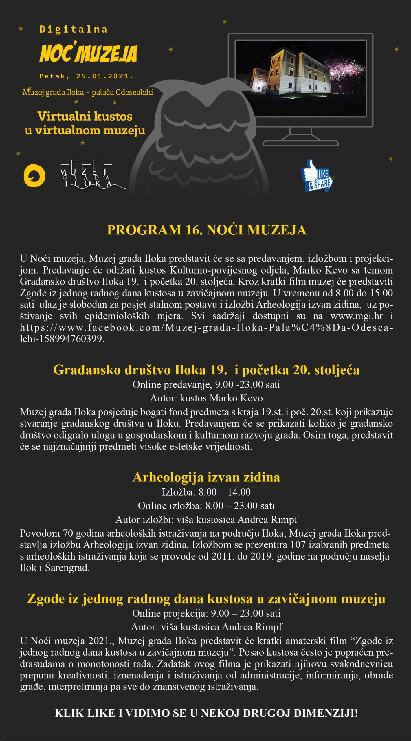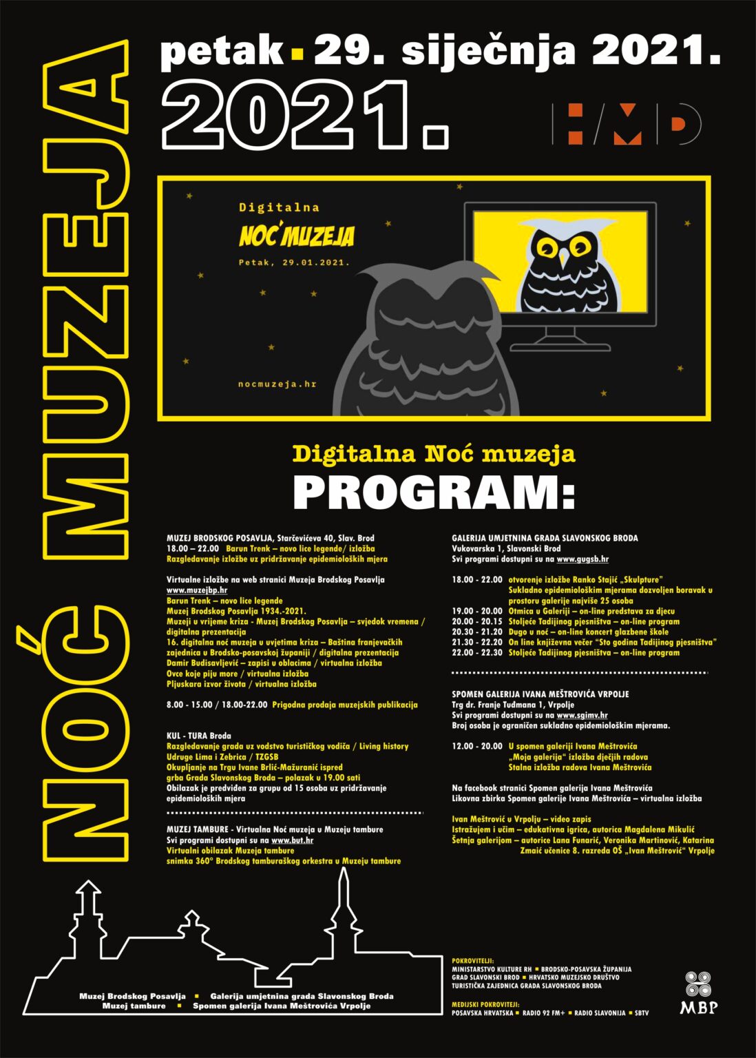 Šesnaesta Noć muzeja održana je 29. siječnja 2021.od 18 do 1 sat iza ponoći, a obilježile su je aktivnosti koje su sukladno mogućnostima i općem epidemiološkom stanju, realizirati muzealci sa svojim suradnicima. Najveći dio programa odvijao se putem digitalnih medija te prenio „uživo“ na gradske trgove i prostore, te gdje to bilo moguće u ograničenom broju u stvarnom prostoru muzeja. Na taj način, još jednom je potvrđena važnost lokalne zajednice za opstojnost muzeja, kao i utjecaj muzeja na razvoj zajednice u kojoj djeluje.