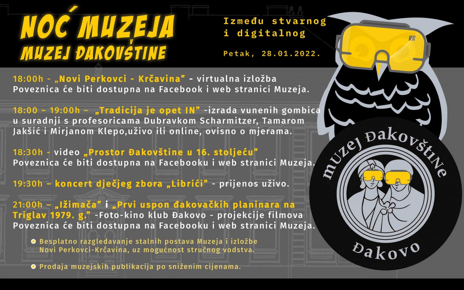Sedamnaesta po redu NOĆ MUZEJA, održana je 28. siječnja 2022. godine u uvjetima koji su bili više-manje slični onima od prošle godine. To znači u okolnostima u kojima su se kulturne institucije silom prilika „adaptirale“ na novu stvarnost, kada se veliki dio programa odvija u kontroliranim uvjetima i okolnostima uz obvezne Covid potvrde, kada je bitno smanjen broj posjetitelja na kulturnim događajima, a grupni organizirani, turistički posjeti muzejskim izložbama, gotovo su potpuno izostali u statistikama muzejskih posjetitelja. Hrvatsko muzejsko društvo organiziralo je 17. Noć muzeja, unatoč globalnoj krizi izazvanoj pandemijom, obzirom da je sama manifestacija u potpunosti poprimila karakteristike nezaobilaznog kulturnog događaja.